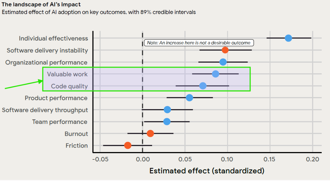 AI increases throughput, but DORA research surprisingly found that developers usually spend less time on what they perceive as “valuable work.”