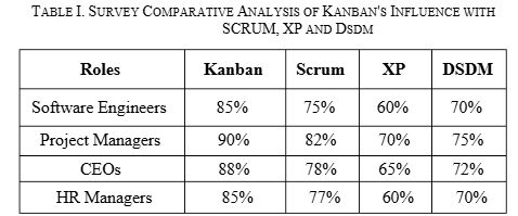 In a 2024 survey of software companies, 85–90% of software engineers, project managers, CEOs, and HR managers reported that Kanban has a stronger positive impact on their work and project outcomes than other Agile methods such as Scrum, XP, or DSDM.